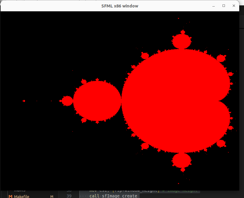 The codes from this chapter are available at this link. Feel free to improve this code by, for instance, adding colors, zoom, mouse input, etc… At some point, developing in assembly should feel just a little less comfortable that using higher level languages 😇.